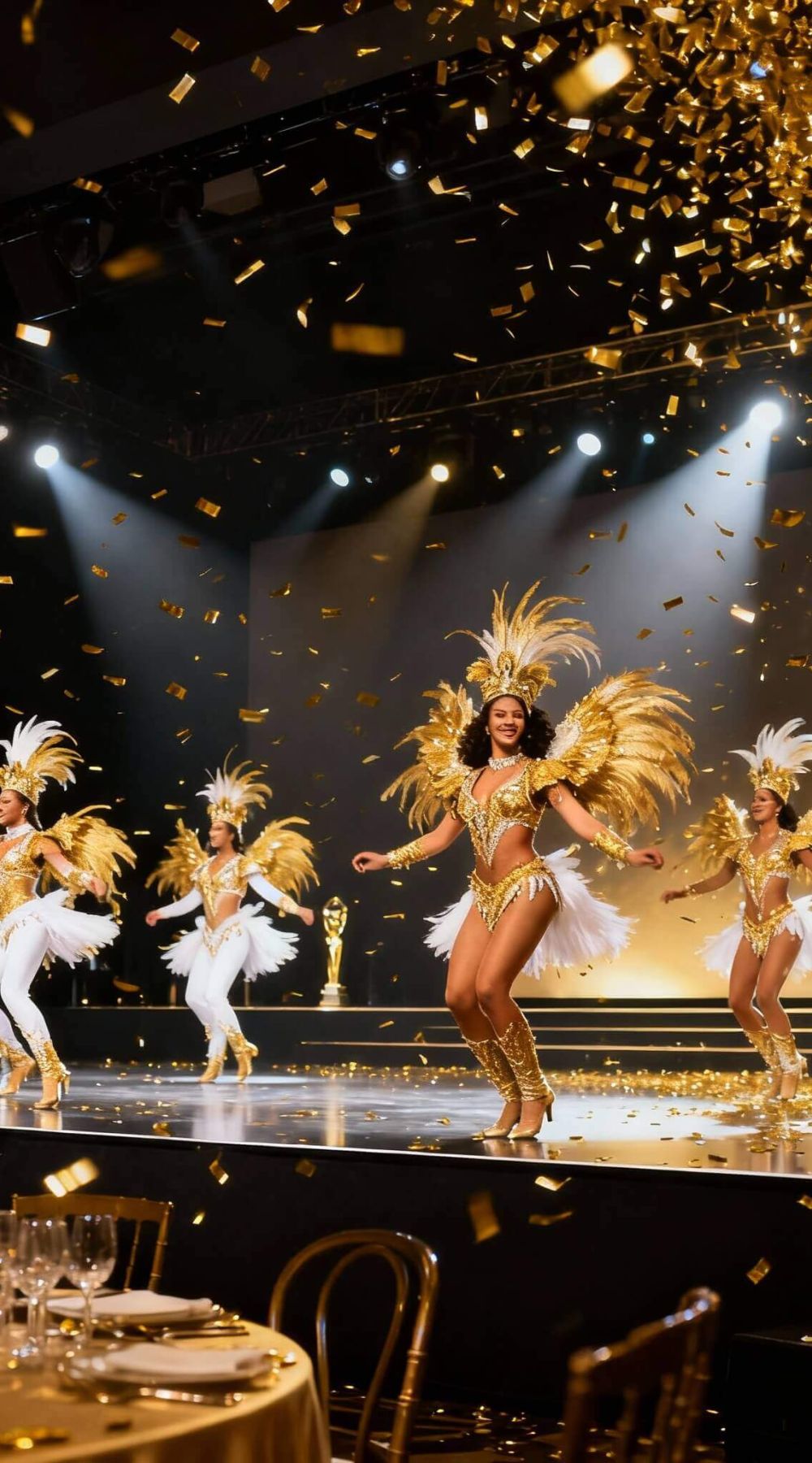A energia pulsante da Bateria de Escola de Samba invade a pista, criando uma transição cinematográfica da cerimônia para a euforia.